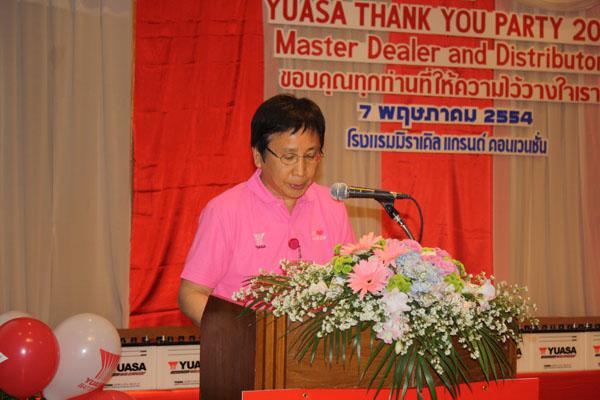 เมื่อวันที่ 7พฤษภาคมที่ผ่านมา บริษัท ยัวร์ซ่าเซลล์ แอนด์ ดิสทริบิวชั่น จำกัด ผู้ผลิตและจัดจำหน่ายผลิตภัณฑ์แบตเตอร์รี่รถยนต์ ยี่ห้อ Yuasa ได้จีดงานเลี้ยงขอบคุณจัวแทนจำหน่ายของบริษัท ในงาน YUASA THANK YOU PARTY พร้อมเผยแผนการตลาดประจำปี 2554 และมอบสิทธิพิเศษให้กับตัวแทนจำหน่ายด้วย
