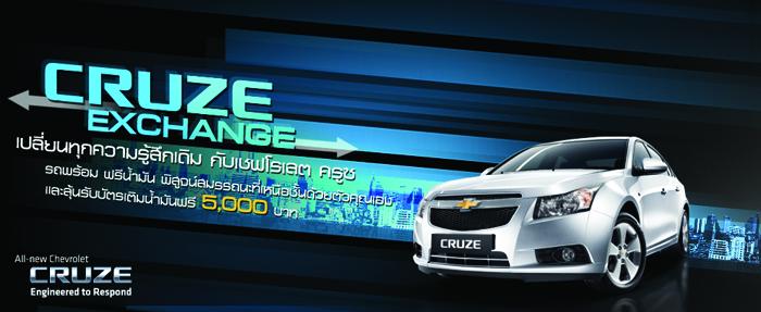 ขึ้นชื่อว่าเป็นค่าย เชฟโรเลต ไม่ว่าจะแถลงข่าวไหน ย่อมสร้างปรากฏการณ์ใหม่ให้วงการรถยนต์ของไทยได้ทุกครั้งจริงๆ ล่าสุด บริษัท เชฟโรเลต เซลส์ (ประเทศไทย) จำกัด เปิดตัวแคมเปญระดับทอล์ก ออฟ เดอะ ทาวน์ อีกครั้ง กับ "CRUZE Exchange" เปลี่ยนความรู้สึกเดิมกับเชฟโรเลต ครูซ ที่เปิดให้ผู้ที่สนใจรถเชฟโรเลต ครูซ และคนที่กำลังมองหารถยนต์คุณภาพคันแรกสักคัน ได้เป็นเจ้าของและทดลองขับเชฟโรเลต ครูซ ฟรี 1 วัน อีกทั้งได้ลุ้นรับของรางวัลอีกมากมายจากเชฟโรเลต โดยแคมเปญ "CRUZE Exchange" เปิดโอกาสให้คุณร่วมสนุกได้หลายช่องทาง ไม่ว่าจะสมัครทางเว็บไซต์ www.chevrolet.co.th หรือเพียงนำรถคุณมาแลก ไม่ว่ารุ่นไหน ยี่ห้อใด ก็เปลี่ยนไปขับรถครูซแทนได้ทันที เติมความสนุกของแคมเปญยิ่งขึ้น ด้วยการให้คุณมองหารถครูซบนรถ Slide on ที่ออกตระเวนทั่วกรุงเทพฯ เพียงพบเห็นและโทรเข้าหมายเลข 080-061-0771 ก็สามารถเปลี่ยนไปขับครูซได้เช่นกัน รถพร้อม ฟรีน้ำมัน เหลือแต่คุณเท่านั้นที่พร้อมหรือยัง ที่จะพิสูจน์สมรรถนะด้วยตัวคุณเอง