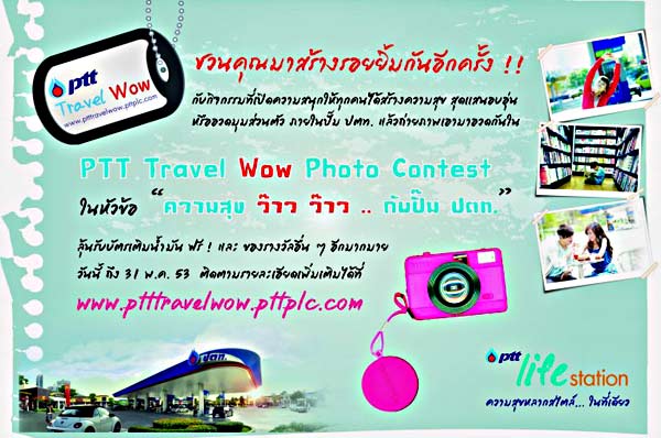 PTT Travel Wow ชวนคุณมาสร้างรอยยิ้มกับกิจกรรมPTT Travel Wow Photo Contest ในหัวข้อ"ความสุข ว๊าว ว๊าว กับปั๊มปตท." พร้อมลุ้นรับบัตรเติมน้ำมันและของรางวัลอีกมากมาย ร่วมสนุกได้ตั้งแต่วันนี้จนถึง วันที่ 31 พ.ค 53 ติดตามรายละเอียดเพิ่มเติมได้ที่ www.ptttravelwow.pttplc.com