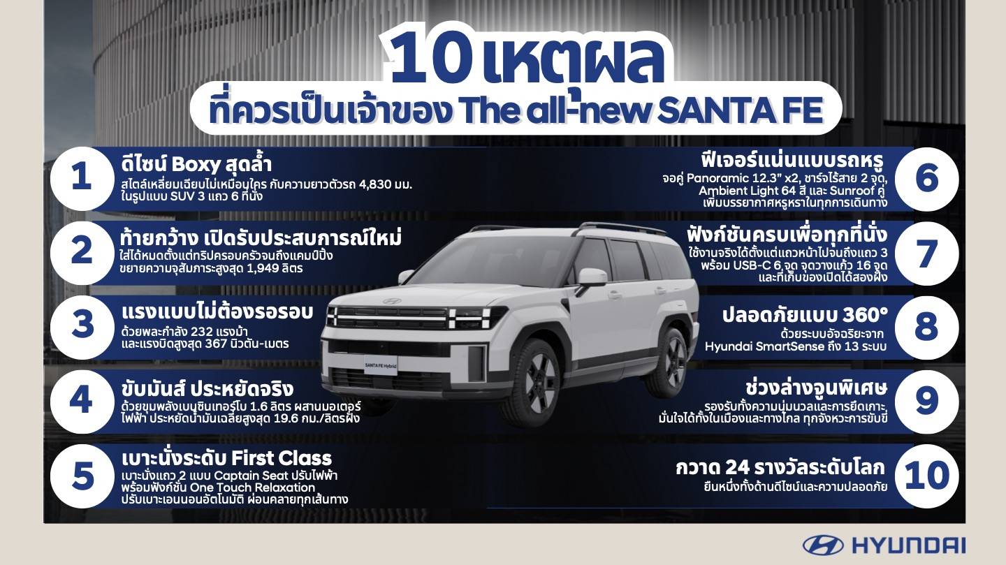 10 จุดเด่นของ Hyundai SANTA FE ที่คุณต้องมองThe all-new SANTA FE ลงสู่สนามอย่างเป็นทางการ นี่ไม่ใช่แค่การมาของรถรุ่นใหม่ แต่มันคือการประกาศสงครามด้วยยนตรกรรม SUV ไฮบริดเรือธง ที่ฉีกทุกกฎเกณฑ์เดิมๆ ด้วยดีไซน์, ออปชัน มีอะไรที่น่าสนใจบ้าง