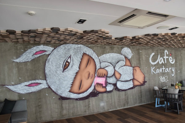 ส่วนงานล่าสุด อเล็กซ์ เฟซ ไปพ่นที่คาเฟ่แคนทารี 304 เขาเลือกภาพที่ให้ดูเข้ากับร้านเค้กแสนอร่อยด้วยการเติมภาพตรงห้องน้ำ โดยการทำเป็นเค้กแบบเลอะ ๆ ส่วนภาพที่เด็กนอนมีความสุขกับการดื่มชาจนชาหก ส่วนภาพข้างล่างก็เป็นเด็กนั่งอยู่บนเค้ก กำลังมีความสุขกับการดื่มเครื่องดื่ม