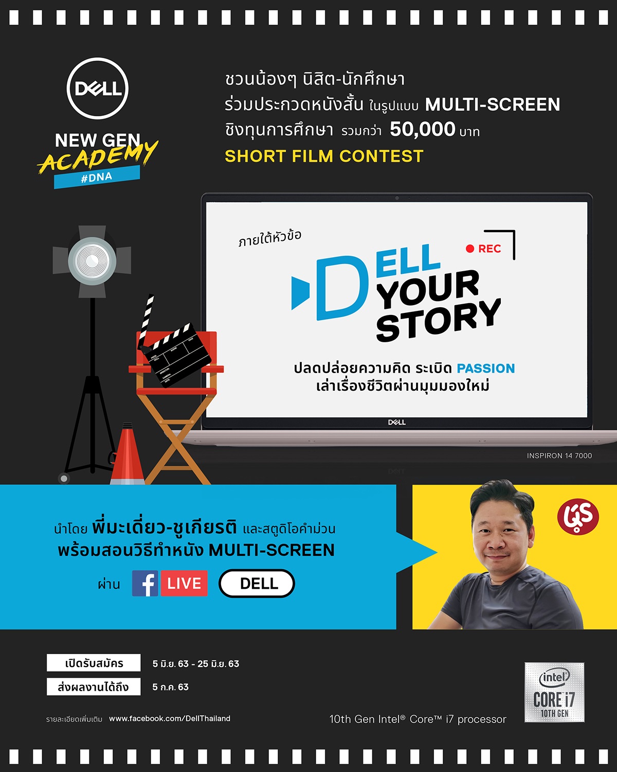 นำโดยมะเดียว - ชูเกียรติ ศักดิ์วีระกุล ผู้กำกับหนังชื่อดังของเมืองไทย จัดกิจกรรมประกวดภาพยนตร์สั้นรูปแบบใหม่ Multi-Screen Short Film Contest ความยาวไม่เกิน 10 นาที ในหัวข้อ “Dell Your Story” เทคโนโลยีกับชีวิตแบบ New normal ภายใต้โครงการ DNA – Dell New Gen Academy ชิงรางวัลและทุนการศึกษากว่า 50,000 บาท พร้อมเกียรติบัตร