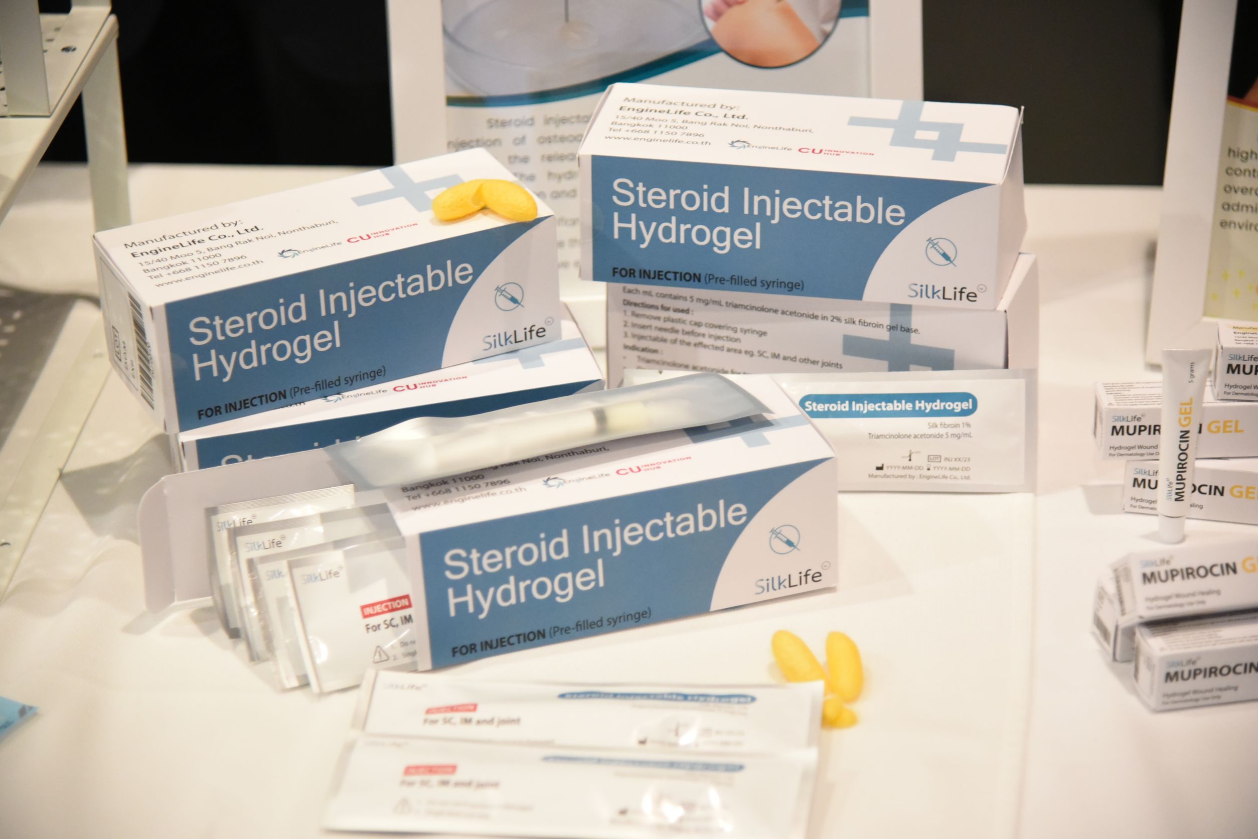 นอกจากนั้น ไหมไทย ยังสามารถนำมาผลิตเป็นครีมไฮโดรเจลจากสารสกัดไหมไทยผสมยาปฏิชีวนะ ใช้สำหรับทาแผลทั่วไป และแผลกดทับ เพื่อช่วยรักษาความชุ่มชื้นในแผล ช่วยส่งเสริมขบวนการหายของแผล และกำจัดเชื้อแบคทีเรีย โดยไฮโดรเจลจากสารสกัดไหมไทยจะช่วยปลดปล่อยยาออกมาในปริมาณที่เหมาะสม และลดความถี่ของการใช้ยาปฏิชีวนะได้ รวมถึงการพัฒนาไฮโดรเจลแบบฉีดได้ ซึ่งเตรียมจากสารสกัดไหมไทยผสมยาสเตียรอยด์ที่เป็นยาทั่วไปที่ใช้ในการรักษาโรคข้อเข่าเสื่อม โดยจะช่วยลดความเจ็บปวดและอาการบวมจากการเสียดสีกันของข้อเข่าที่เสื่อมและต้านการอักเสบ ไฮโดรเจลจากสารสกัดไหมไทยสามารถช่วยปกป้องตัวยาไม่ให้เสื่อมสลาย และช่วยชะลอการปลดปล่อยของตัวยาให้ออกมาในปริมาณที่เหมาะสม แต่เนิ่นนานขึ้น ส่งเสริมให้ตัวยายังคงมีประสิทธิภาพในการรักษานานขึ้น และลดความถี่ของการฉีดยาสเตียรอยด์ได้ นอกจากนี้ไหมไทยยังสามารถต่อยอด ผลิตเป็นแผ่นแปะช่วยผ่อนคลาย แผ่นไฮโดรเจลนวัตกรรมใหม่ ที่มีไฟโบรอินจากไหมไทยที่ประสิทธิภาพในการช่วยชะลอการปลดปล่อย cannabidiol (CBD) อย่างช้าๆ ซึ่งจะช่วยผ่อนคลาย ลดความเครียด ช่วยให้นอนหลับง่าย และช่วยให้การนอนหลับลึกขึ้น โดยมีผลการทดสอบทางวิทยาศาสตร์รองรับ รวมถึงผ่านการทดสอบทางผิวหนัง และการผลิตอยู่ภายใต้มาตรฐาน GMP