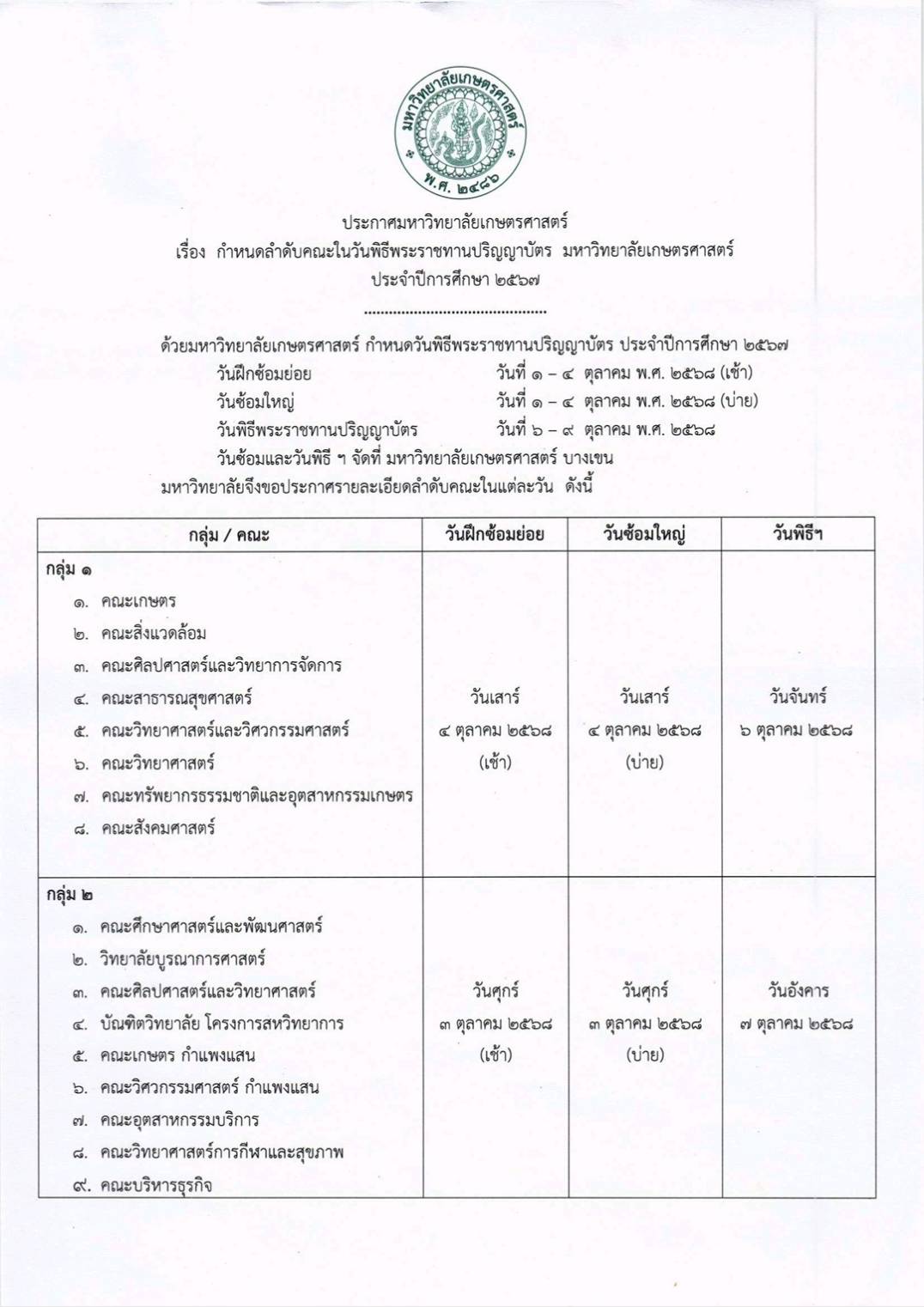ประกาศมหาวิทยาลัยเกษตรศาสตร์ เรื่อง กำหนดลำดับคณะในวันพิธีพระราชทานปริญญาบัตร มหาวิทยาลัยเกษตรศาสตร์ ประจำปีการศึกษา 2567 ณ อาคารจักรพันธ์เพ็ญศิริ มหาวิทยาลัยเกษตรศาสตร์ วิทยาเขตบางเขน