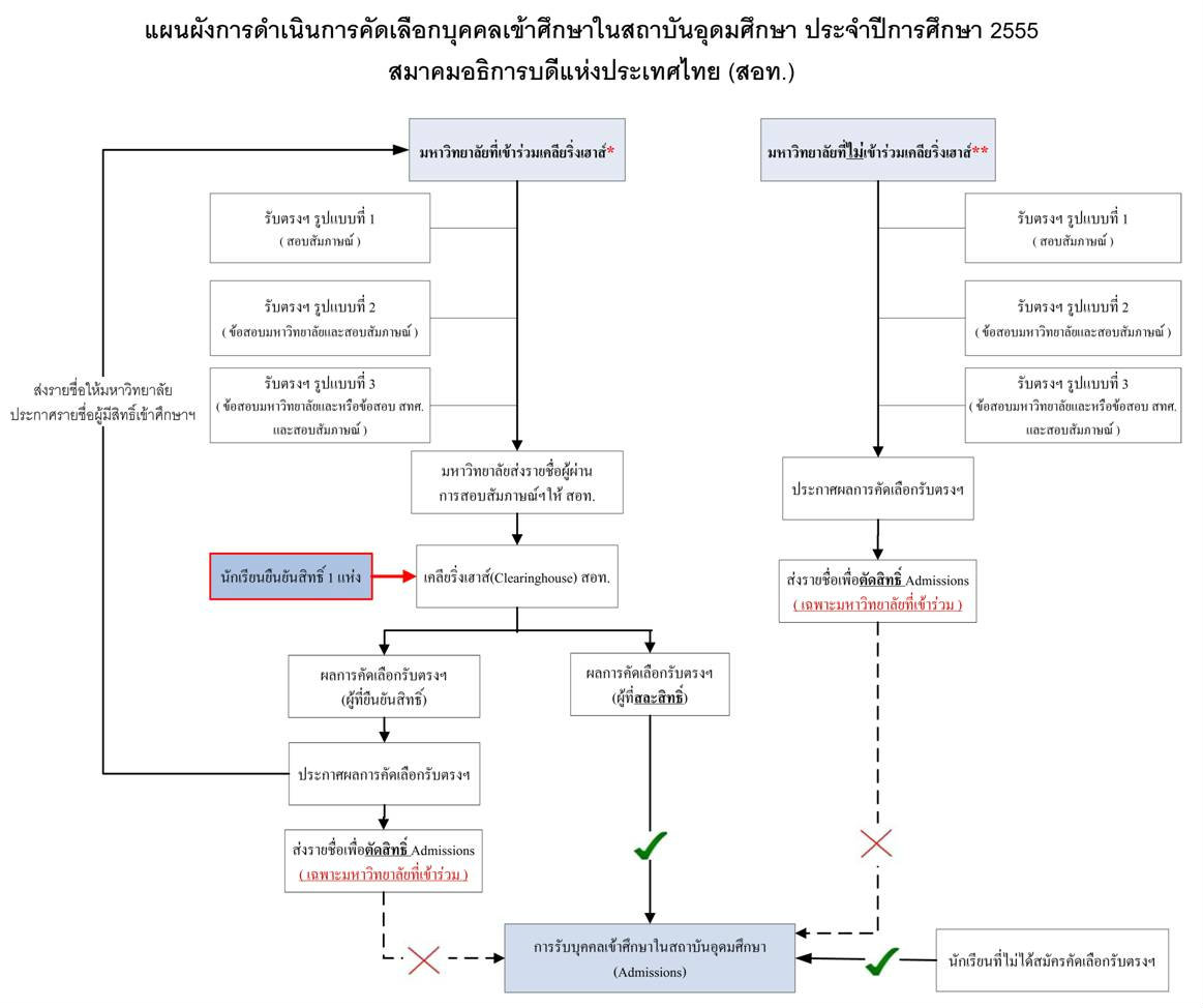 หลังจากการจัดตั้งองค์กรกลางเพื่อจัดการเรื่องของการรับตรงร่วมของมหาวิทยาลัยทั่วประเทศ หรือที่เรียกว่า เคลียร์ริ่งเฮ้าส์ (Clearing House) จาก สมาคมอธิการบดีแห่งประเทศไทย (สอท.) รวมไปถึงรายชื่อมหาวิทยาลัยที่เข้าร่วม และระเบียบการสมัครโครงการรับตรงต่างๆของแต่ละมหาวิทยาลัย น้องๆบางคนก็อาจจะสมัครโครงการรับตรงไปแล้ว ทั้งๆ ที่ยังงงๆ และมีคำถามอยู่ว่า Clearing House จะตัดสิทธิ์โครงการรับตรงหรือ Admission อย่างไร ขณะนี้ สอท. ได้ประกาศแผนผังการดำเนินการคัดเลือกบุคคลเข้าศึกษาในสถาบันอุดมศึกษา ปี2555 ออกมาแล้ว หรือจะพูดให้ง่ายขึ้น คือ ขั้นตอนของการตัดสิทธิ์ ของ Clearing House นั่นเอง
