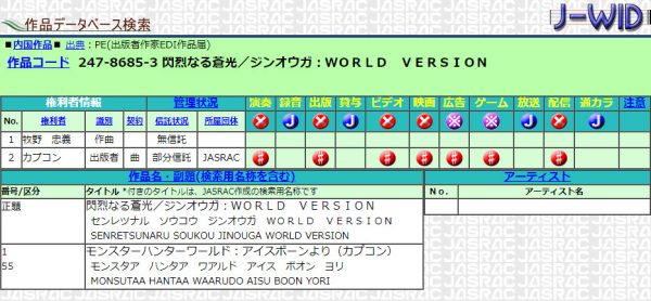 เบาะแสดังกล่าวปรากฏขึ้นบนเว็บไซต์ JASRAC มีเพลงน่าสงสัย “Senretsunaru Soukou Zinogre: The Chase” กับ “Senretsunaru Soukou Zinogre World Version” โดยทั้ง 2 เพลงมีเจ้าของลิขสิทธิ์ คือ Tadayoshi Makino กับ Capcom