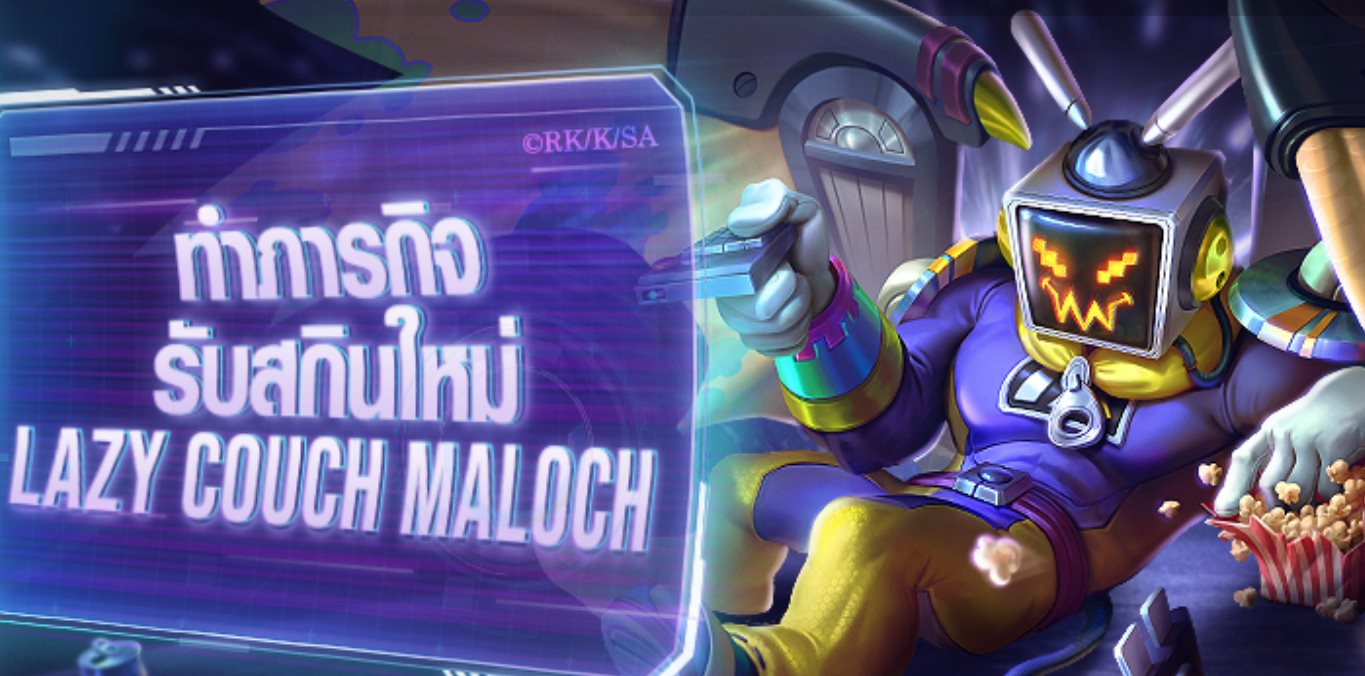- สะสมพลังใจครบ 18 ครั้งเพื่อรับรางวัลสกิน Maloch : Lazy Couch