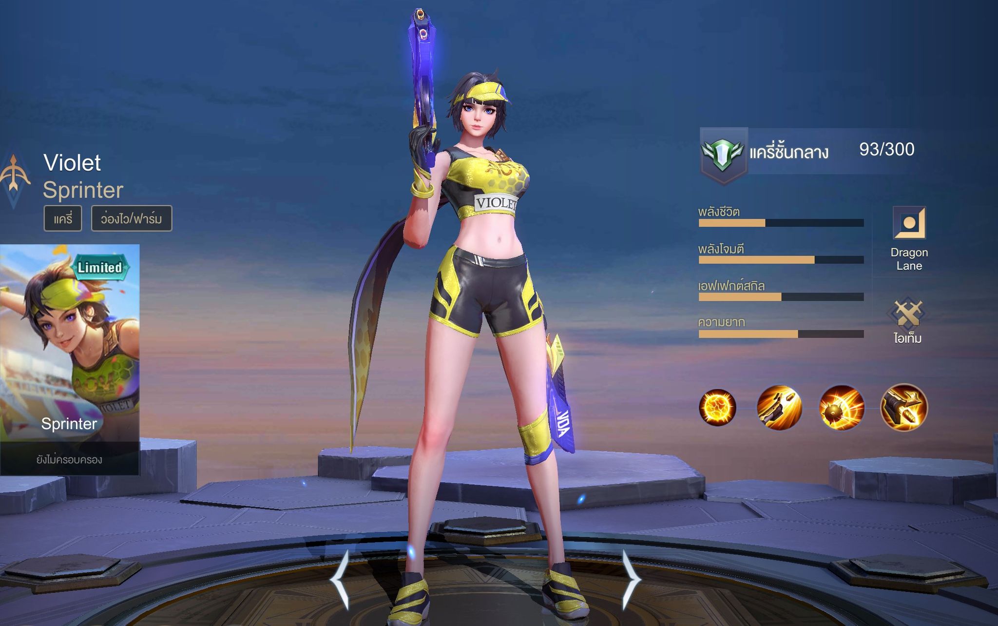 เช่นเดียวกับ Maloch ซึ่งสกินของเธอคราวนี้มาในชุดนักวิ่ง Violet นี้เป็นตัวที่มีสกินเรียกได้ว่าเยอะเป็นอันดับต้นๆของเกม เธอผ่านมาแล้วทุกบทบาทไม่ว่าจะเป็นชุดตรุษจีน,เจ้าสาว,นักบิน,ชุดว่ายน้ำ,ชุดนักเรียน,อนิเมะ,หุ่นยนต์เรียกได้ว่าเธอเป็นให้หมดทุกอย่างแล้ว ซึ่งสกินตัวนี้เป็นตัวที่ 12 ของเธอแล้วเอ้ามาดูเงื่อนไขรับเธอเข้าคลังรูปแบบกิจกรรมของเธอก็คล้ายกับ Maloch เลยเรียกได้ว่าทำภารกิจครบรับไป 2 สกินนั่นแหละ