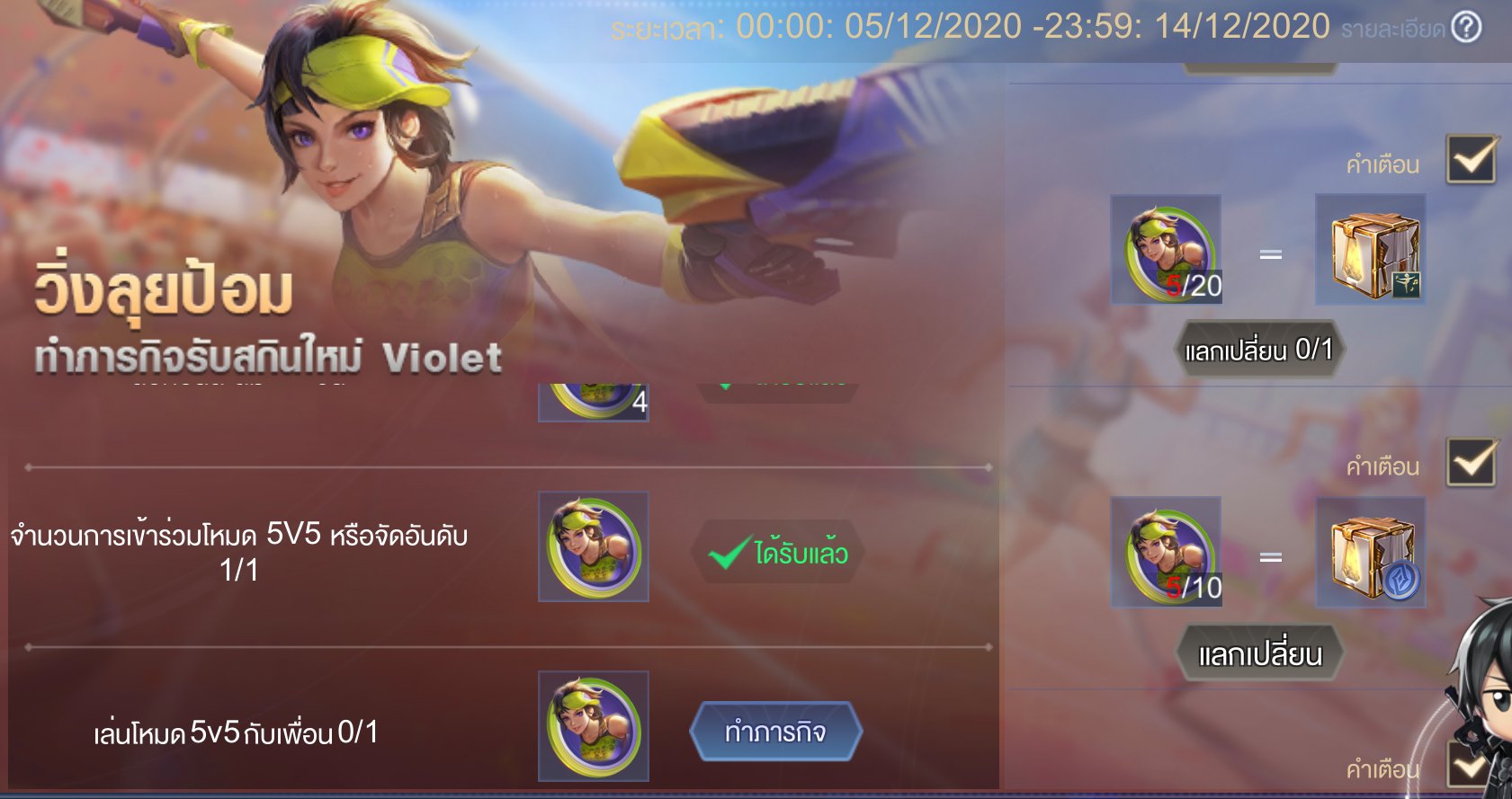 ซึ่งตรงนี้เพื่อนๆก็จะสามารถเก็บแต้มจำนวนสูงสุดต่อวันได้ถึง 6 แต้มนะครับแล้วก็หากเราเก็บสะสมจนครบ 36 แต้มก็รับไปเลยกับสกิน Violet : Sprinter แล้วก็มีกล่องท่าเต้นของ Violet ด้วยนะถ้าเพื่อนๆเก็บแต้มสะสมครบ 20 แต้มก็สามารถรับได้เช่นกัน ก็จบการแนะนำแต่เพียงเท่านี้อย่าลืมไปรับกันล่ะครับสวัสดี