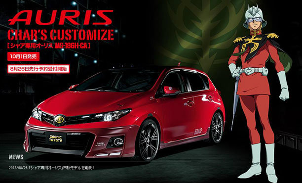 สิงหาคมเดือนเดียวกันปีที่แล้ว ทาง Toyota ได้เปิดตัวรถสีแดงมีเขา (แต่ไม่ได้แรง 3 เท่า) ของท่านชาร์ ตัวร้ายยอดนิยมจากอนิเมะการ์ตูนดังเรื่อง Gundam ภายในงาน Character Hobby 2012 (ดูเพิ่มเติมได้ที่ http://game.sanook.com/949570) ซึ่งในตอนนั้นรถนี้ยังเป็น Concept ให้ชมกันเท่านั้น ยังไม่ได้ทำออกมาจำหน่าย และเวลาก็ผ่านไปหนึ่งปีพอดิบพอดี ในที่สุดทาง Toyota ก็ประกาศทำ Toyota Auris Char's customize รุ่นดังกล่าวออกมาขายให้ซื้อไปขับกันแล้ว โดยมีกำหนดวางขายในวันที่ 1 ตุลาคม 2013 โดยสามารถจองได้ตั้งแต่วันนี้เป็นต้นไป