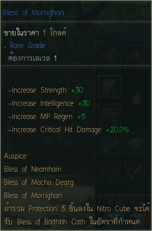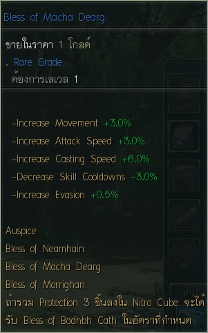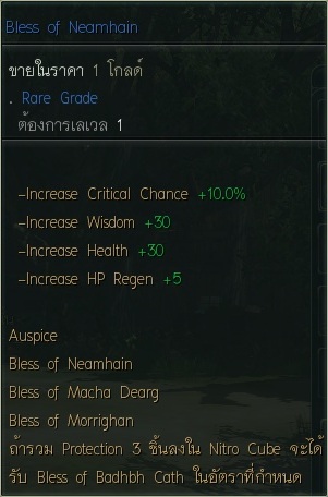 Auspice: Bless of Neamhain // Bless of Macha Dearg // Bless of Morrighan (ไม่ล็อก)รายละเอียดของ Auspice ตามด้านล่าง |