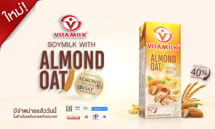 ลองชิมคุณค่าความอร่อยของน้ำนมถั่วเหลืองไวตามิ้ลค์อัลมอนด์โอ๊ตได้ในราคา 15 บาท มีจำหน่ายแล้ววันนี้ ที่ Tops Market, Tesco Lotus, Lawson 108, Foodland, The Mall, Villa Market และ 7-Eleven ทุกสาขาทั่วประเทศ