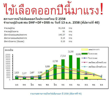 ปริมาณผู้ป่วยโรคไข้เลือดออก ปกติจะมากขึ้นทุกๆ 3-4 ปี แต่ปี 2558 นี้ที่ยังไม่ควรจะเป็นปีที่ระบาด กลับพบจำนวนผู้ป่วยโรคไข้เลือดออกมากผิดปกติ นั่นคือ เดือนสิงหาคม 2558 พบผู้ป่วย 22,253 คน เดือนกันยายน 2558 พบผู้ป่วย 18,981 คน ซึ่งมากกว่าเดือนกันยายน 2556 ซึ่งเป็นปีที่ไข้เลือดออกระบาดเสียอีก (เดือนกันยายน 2556 พบผู้ป่วย 11,844 คน)