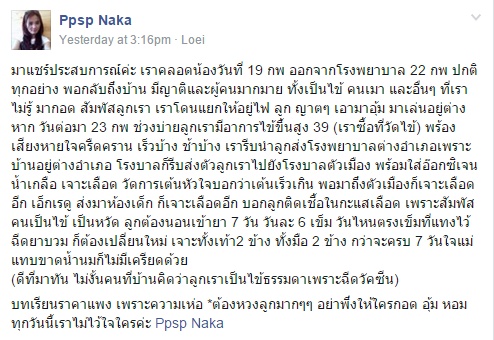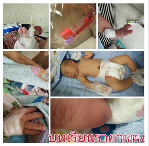 เด็กน้อยเพิ่งคลอดอายุ 3-4 วันของคุณ Ppsp Naka ติดเชื้อในกระแสเลือด เนื่องจากเหล่าญาติ และคนอื่นๆ ที่มาเยี่ยมลูกน้อย ทั้งกอด ทั้งอุ้มเล่นกันอยู่หลายมือ สุดท้ายพบว่าลูกน้อยไข้ขึ้นสูง พาไปหมอ หมอจึงแจ้งให้ทราบว่าลูกติดเชื้อในกระแสเลือด เนื่องมาจากติดไข้มาจากคนอื่น จึงต้องทำการรักษาที่โรงพยาบาล ทั้งฉีดยา 6 เข็มจนตัวบวม ฉีดจนกว่าจะครบ 7 วัน