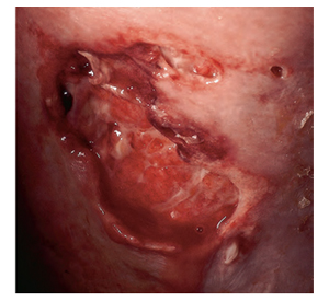 รูปการติดเชื้อแบคทีเรียที่ผิวหนังชั้นลึกถึงระดับเนื้อเยื่อหุ้มกล้ามเนื้อ (necrotizing fasciitis)