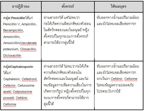 โดยสรุปแล้วยากลุ่ม Penicillinและ Cephalosporin ค่อนข้างมีความปลอดภัยเมื่อใช้ในหญิงตั้งครรภ์ หรือให้นมบุตร ถ้ามีประวัติแพ้ยากลุ่มดังกล่าว ควรเปลี่ยนเป็นยากลุ่ม Clindamycin หรือ Macrolide เช่น Erythromycin และ Azithromycin ทั้งนี้ขึ้นอยู่กับลักษณะและความรุนแรงของโรค อย่างไรก็ตามหากมีข้อสงสัยในการใช้ยา ควรปรึกษาแพทย์หรือเภสัชกรทุกครั้ง