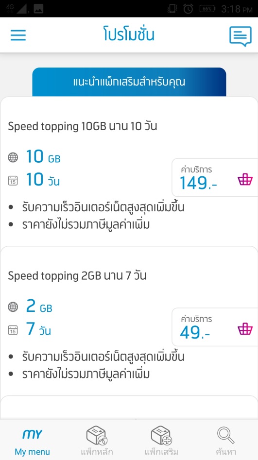 ฟังก์ชันต่อมาที่มีประโยชน์มาก คือ โปรโมชั่น ที่จัดเหล่าโปรโมชั่นเด็ดๆ ไว้ให้คุณเลือกซื้อ ทั้งแพ็คเกจการโทร รวมทั้ง Topping ต่างๆ ตามไลฟ์สไตล์ของคุณ แถมยังมีให้เลือกหลายรูปแบบและหลายราคาด้วย