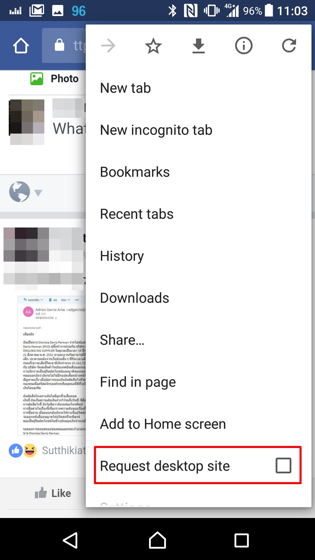 จากนั้นให้กด 3 จุดข้างขวา เลือกเป็น Request desktop Site เท่านี้เว็บ Facebook จะเป็นเวอร์ชั่น Desktop เรียบร้อย