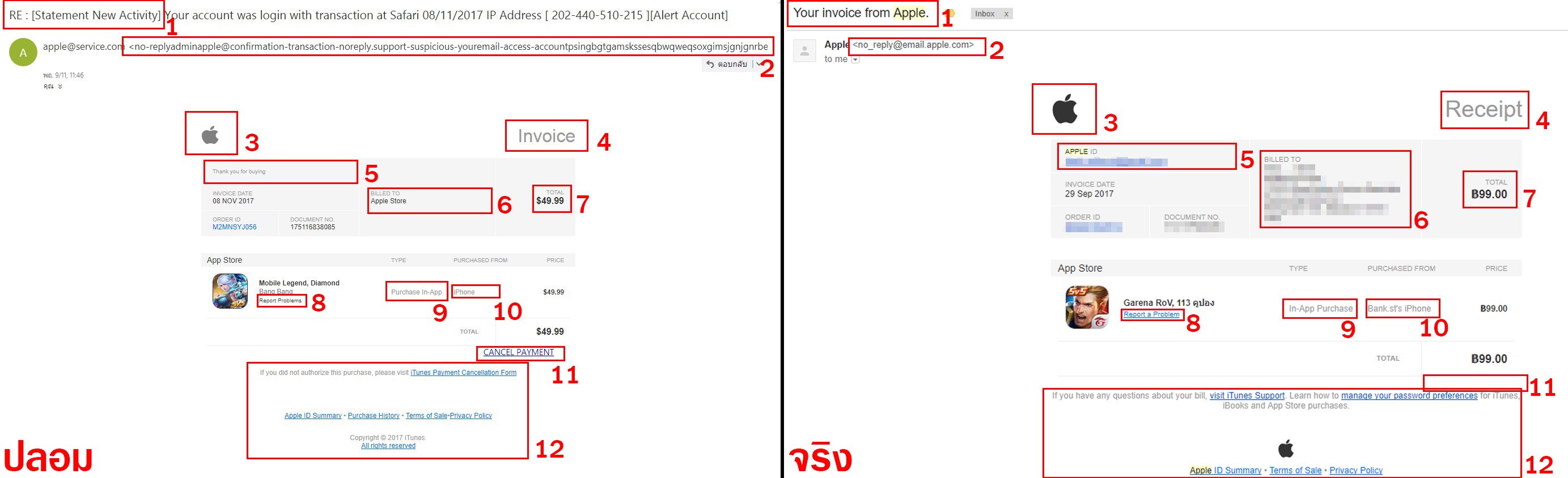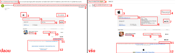 4. ใบเสร็จ - ในอีเมล Apple ของจริง แม้หัวข้อจะใช้ว่า invoice แต่รายละเอียดด้านในจะใช้คำว่า Receipt ตรงนี้ต้องสังเกตกันเล็กน้อย