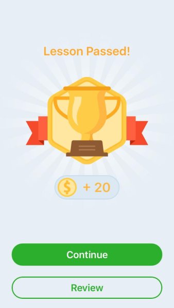 การมีควิซตบท้ายในบทเรียน ก็ทำให้เราได้ประเมินศักยภาพของตัวเองต่อบทเรียนนั้นๆ พร้อมทั้งทวนเนื้อหาที่เรียนไปในตัว และทุกครั้งที่จบบทเรียนเราจะได้เหรียญรางวัลมาสะสม ซึ่งเหรียญเหล่านี้จะใช้ในการปลดล็อคกิจกรรมต่างๆ ในแอปได้