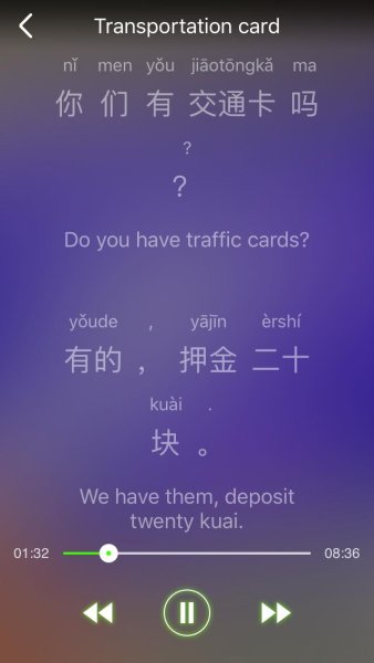 เมนู “Immerse” เมนูที่จะทำให้คุณซึมซับภาษาจีนได้อย่างมากขึ้น โดยมีบทเรียนที่เป็นการสนทนาในชีวิตประจำวัน ทั้งการสั่งอาหาร การจองห้องพัก การเดินทาง ฯลฯ และในบทเรียนยังสอนเรื่องไวยกรณ์ คำศัพท์และการออกเสียงต่างๆ รวมถึงมีแบบฝึกหัดให้ทำด้วย