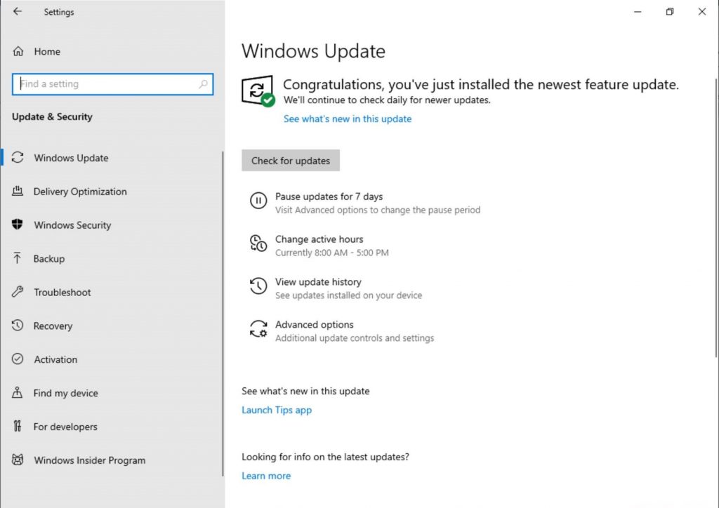 Pause Update: ผู้ใช้งานสามารถพักการอัปเดตโดยสามารถเลือกได้ว่าจะพักการอัปเดตไว้กี่วัน ซึ่งสามารถทำได้ใน Settings > Update and Security > Windows Update