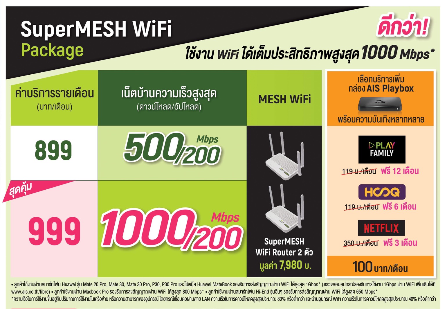 ลูกค้าใหม่และลูกค้าปัจจุบันสามารถสมัครแพ็กเกจ AIS FIbre SuperMESH WiFi ได้ตั้งแต่วันที่ 11 มกราคม 2563 ด้วยแพ็กเกจที่คุ้มค่าที่สุด ความเร็ว 1000/200 Mbps เพียง 999 บาทต่อเดือน พร้อมรับฟรี! AIS FIbre SuperMESH WiFi Router จำนวน 2 ตัว มูลค่า 7,980 บาท นอกจากนี้ ยังสามารถเลือกเพิ่มบริการเสริม AIS PLAYBOX เพียง 100 บาทต่อเดือน ที่มาพร้อมคอนเทนท์ระดับโลกแบบฟินจุใจจากช่องดัง กับแพ็กเกจ PLAY FAMILY นาน 12 เดือน, HOOQ นาน 6 เดือน และ NETFLIX นาน 3 เดือน ฟรี! รวมมูลค่าคอนเทนท์ 3,192 บาท ทั้งนี้ หากลูกค้าต้องการเพิ่มจุดเราท์เตอร์ในบ้าน สามารถแจ้งช่างติดตั้งได้ทันที ณ วันติดตั้ง พร้อมรับโปรโมชั่นพิเศษลด 50% เหลือเพียงจุดละ 1,990 บาท (จาก ปกติ 3,990 บาท)
