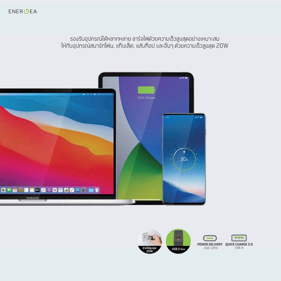 หากชาร์จไฟ 2 ช่องพร้อมกันให้กำลังไฟ 15W โดย Energea รุ่น AMPCHARGE PD20+ มีระบบปกป้องอุปกรณ์ ของคุณด้วยการจ่ายกำลังไฟตามกำลังสูงสุดเท่าที่โทรศัพท์จะรับได้ เพื่อให้แบตเตอรี่ไม่เสื่อมเพราะมีระบบตรวจตัดไฟ รองรับการเชื่อมต่อของสาย USB-A, USB-C ทั้งรุ่นใหม่และรุ่นเก่าของคุณได้อย่างสบายๆ กับการชาร์จกับ iPhone, iPad, Smart Phone และอุปกรณ์อื่นๆได้เป็นอย่างดี โดย Energea รุ่น AMPCHARGE PD20+ มีราคาพิเศษช่วงเปิดตัว iPhone 12 เหลือเพียง 790 (ปกติ 890 บาท)