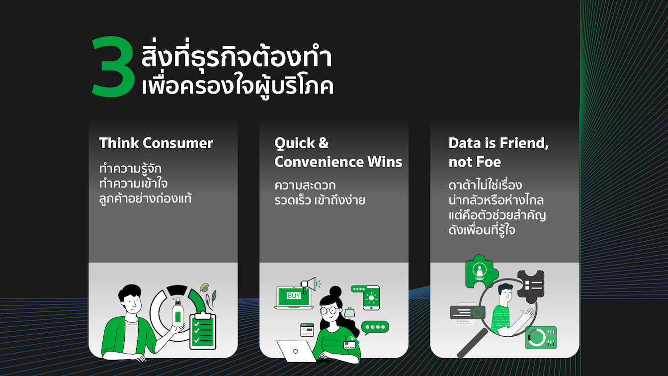 แบรนด์หรือนักการตลาด ต้องเข้าใจความต้องการและความรู้สึกของผู้บริโภคจากข้อมูลเหล่านี้ เพื่อนำเสนอสินค้าบริการที่ช่วยแก้ปัญหา รวมถึงสร้างช่องทางและประสบการณ์การสื่อสารที่ตรงใจ โดยสิ่งสำคัญที่สุด 3 อย่างที่ธุรกิจต้องทำเพื่อครองใจผู้บริโภคในปัจจุบัน คือ 1) Think Consumer ทำความรู้จัก ทำความเข้าใจลูกค้าอย่างถ่องแท้ ถึงรายละเอียดและปัจจัยความต้องการ ความรู้สึกต่างๆ ของลูกค้า เพื่อนำมาวิเคราะห์หาวิธีและรูปแบบการนำเสนอสินค้าและบริการที่ตรงใจ ตรงความต้องการ โดยอาศัยเทคโนโลยีมาช่วย 2) Quick & Convenience Wins ความสะดวก รวดเร็ว เข้าถึงง่าย เป็นเรื่องสำคัญ สินค้าและบริการต้องอยู่ถูกที่ถูกเวลา เพื่อให้ลูกค้าเห็นและเลือกซื้อ เลือกใช้ได้อย่างง่ายดายที่สุด 3) Data is Friend, not Foe ดาต้าไม่ใช่เรื่องน่ากลัวหรือห่างไกล แต่คือตัวช่วยสำคัญดังเพื่อนที่รู้ใจ แบรนด์ควรต้องให้ความสำคัญกับการเก็บข้อมูลที่เหมาะสม และนำมาใช้เพื่อการวิเคราะห์อย่างเป็นระบบ