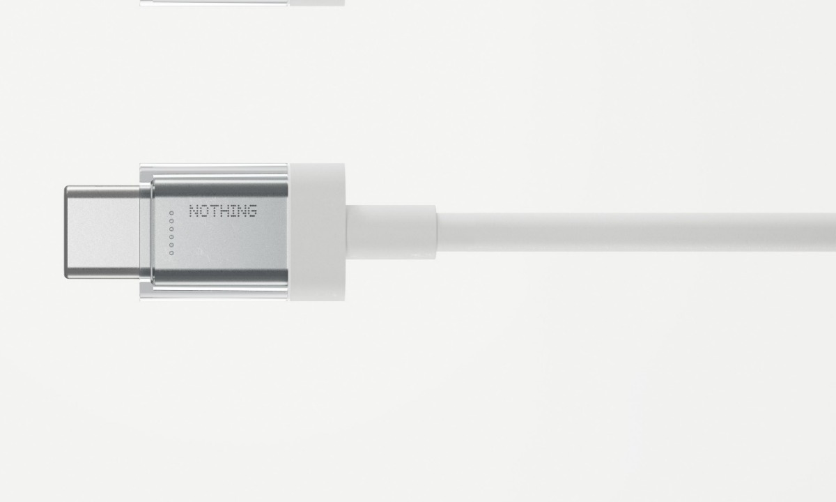 สิ่งที่สังเกตได้คือหัวของสาย USB-C นั้นจะเป็นพลาสติกใสทั้ง 2 ด้านและมีโลโก้ Nothing และมีเส้นภายในทั้งหมด 6 สายเพื่อต่อเชื่อภายในแต่ยังไม่แน่ชัดว่ามีไฟ LED หรือไม่ไม่ แต่การออกแบบสายนั้นจะคล้ายกับเข็มจิ้มถาดใส่ซิมของ Nothing Phone (1)