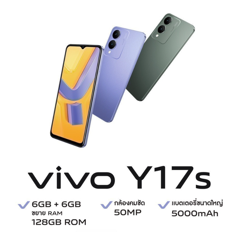 อัปเดตราคา vivo Y17s มือถือรุ่นประหยัดราคาลดลงเริ่มต้น 3,699 บาทvivo Y17s ลดราคา สมาร์ทโฟนที่มาพร้อมกล้องหลังคู่ 50MP แบตเตอรี่อึด 5000mAh ชิปเซ็ต Helio G35 ลื่นไหล เล่นเกมได้สบาย
