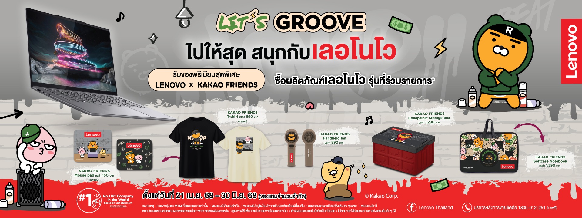 Lenovo ประเทศไทย เปิดตัวแคมเปญ "Let’s Groove with Lenovo" ชวนเหล่าสาวก Lenovo และแฟน ๆ KAKAO FRIENDS มาอัปเกรดอุปกรณ์และชีวิตให้สมาร์ทยิ่งขึ้น พิเศษ! เมื่อซื้อผลิตภัณฑ์ Lenovo ที่ร่วมรายการ รับฟรีของพรีเมียม Lenovo x KAKAO FRIENDS สุดน่ารัก ซึ่งเป็นการผสมผสานนวัตกรรมจาก Lenovo เข้ากับคาแรคเตอร์ยอดฮิตจาก KAKAO FRIENDS. โปรโมชั่นนี้มีตั้งแต่วันที่ 21 เมษายน ถึง 30 มิถุนายน พ.ศ. 2568
