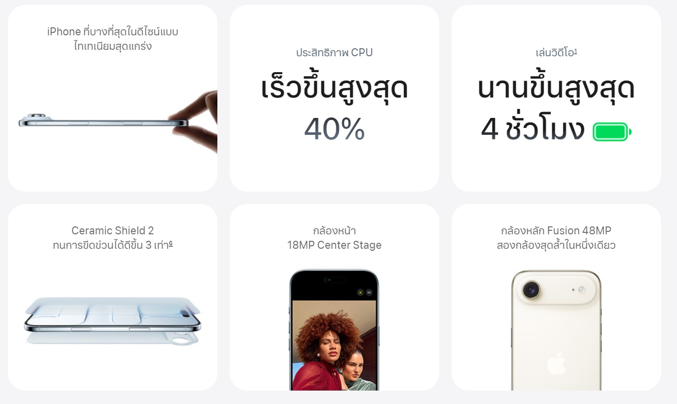 | กล้องหลัง | กล้องหลัก Fusion 48MP (ตัวเดียว) | คุณภาพกล้องหลักใกล้เคียงกับ iPhone 16E แต่ได้รับการปรับปรุงด้วย Fusion Camera System ใหม่ |