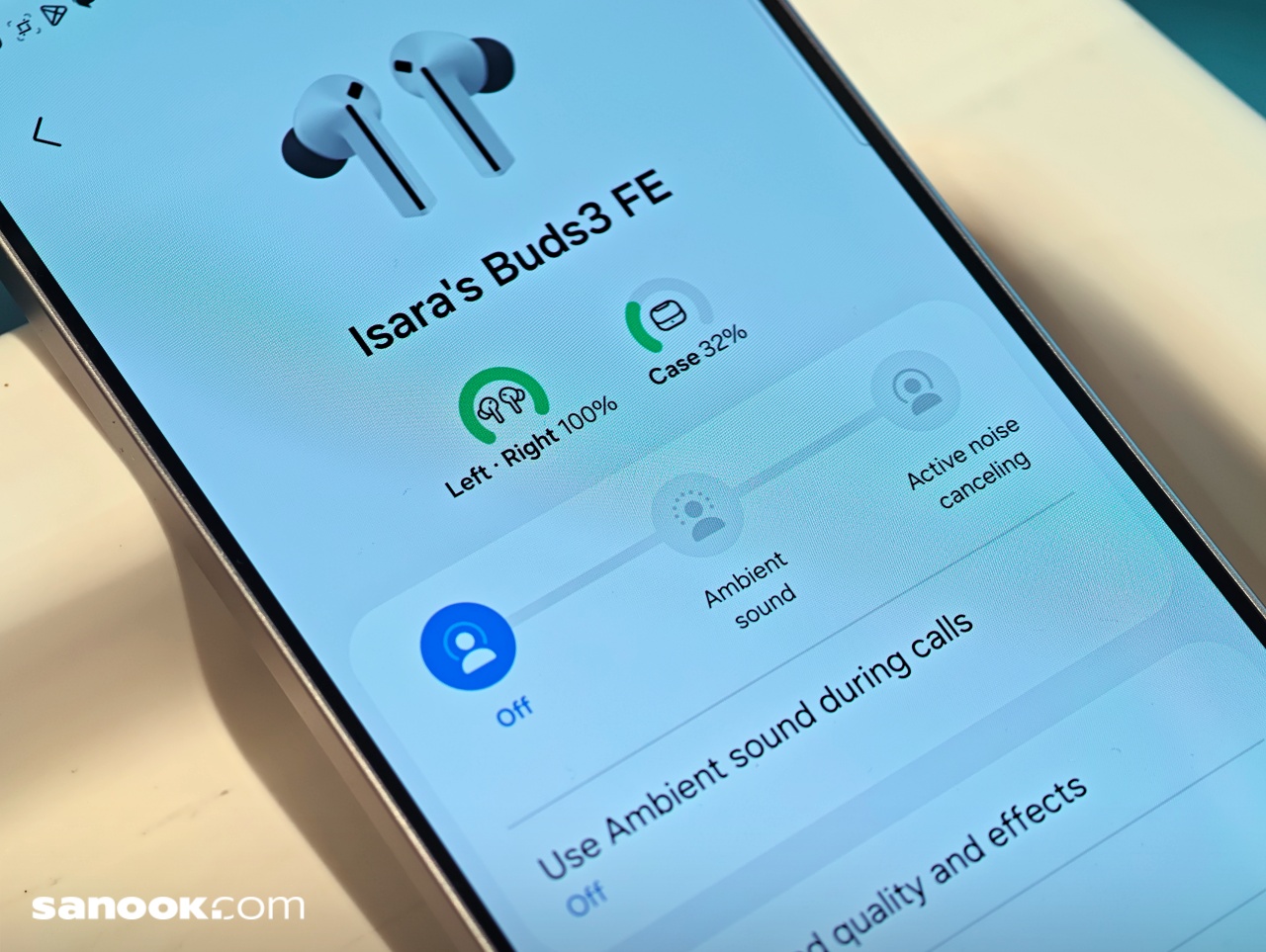 จากการทดลองฟัง พบว่าคุณภาพเสียงของ Galaxy Buds3 FE จะเน้น "เบสที่หนักแน่นและลงได้ลึก" เป็นพิเศษ ถูกใจคนชอบฟังเพลงแนว Pop, Rock, EDM หรือ Hip-Hop อย่างแน่นอนครับ ด้วยไดรเวอร์แบบ 1-Way Dynamic ขนาดใหญ่ ทำให้เสียงเบสมีมวลและแรงปะทะที่ดี ส่วนเสียงกลางและเสียงแหลมก็ยังทำได้ดี มีความชัดเจนและแยกรายละเอียดชิ้นดนตรีได้ในระดับที่น่าพอใจ สามารถปรับ EQ เพิ่มเติมได้ในแอป Galaxy Wearable เพื่อให้ได้แนวเสียงที่ชอบ
