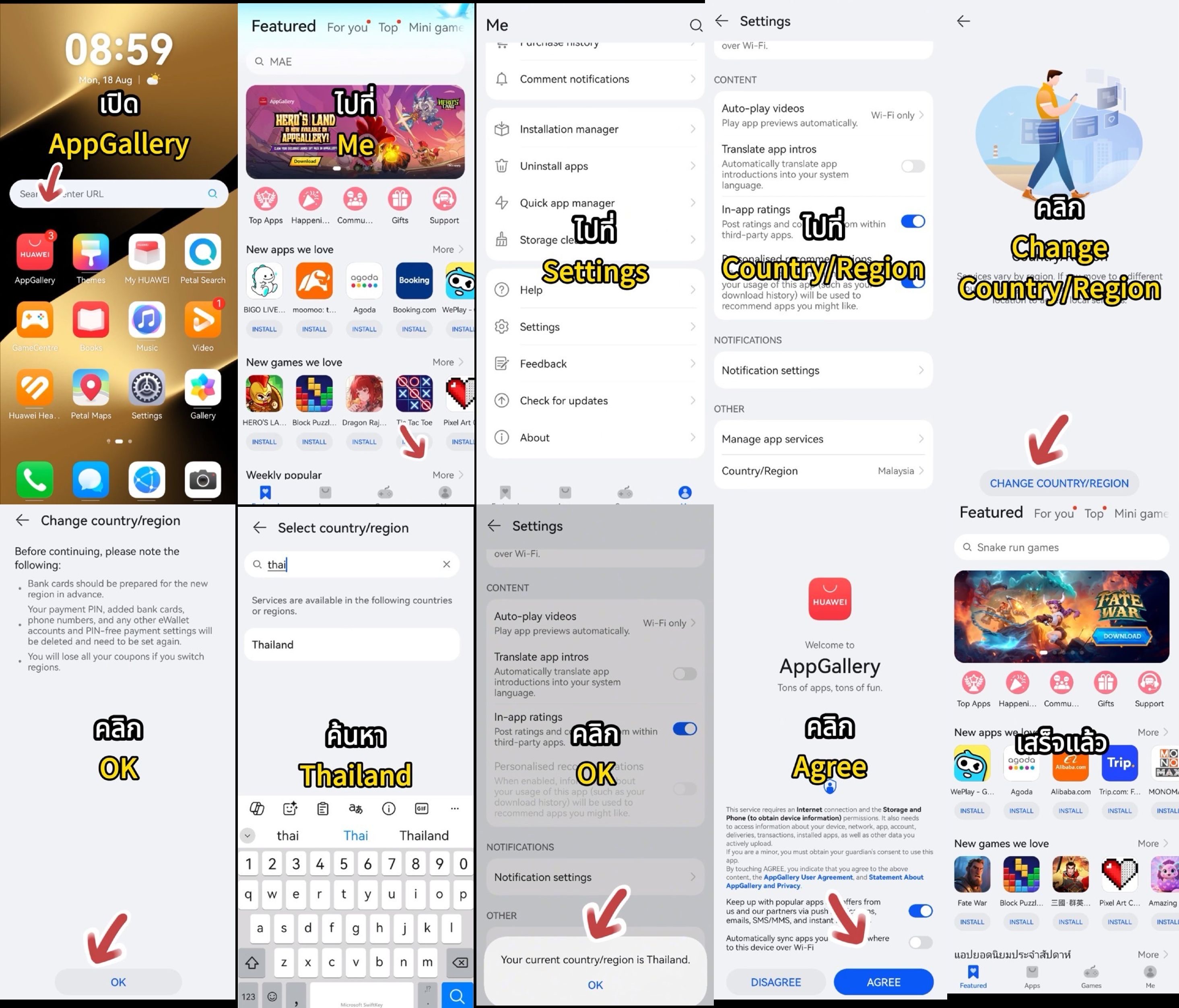 การตั้งค่าภูมิภาคของ AppGallery เป็นประเทศไทย จะทำให้เราเข้าถึงแอปในเวอร์ชันที่ถูกต้อง ซึ่งจะทำให้บริการต่างๆ ของ Google ทำงานได้ราบรื่น โดยวิธีการตั้งค่าไม่ยาก เพียงเข้าไปที่ AppGallery เลือก Me (ฉัน) > Settings (การตั้งค่า) > Country / Region (ประเทศ / ภูมิภาค) เมื่อตั้งเป็นประเทศไทยแล้ว ก็ทำขั้นตอนถัดไปได้เลย