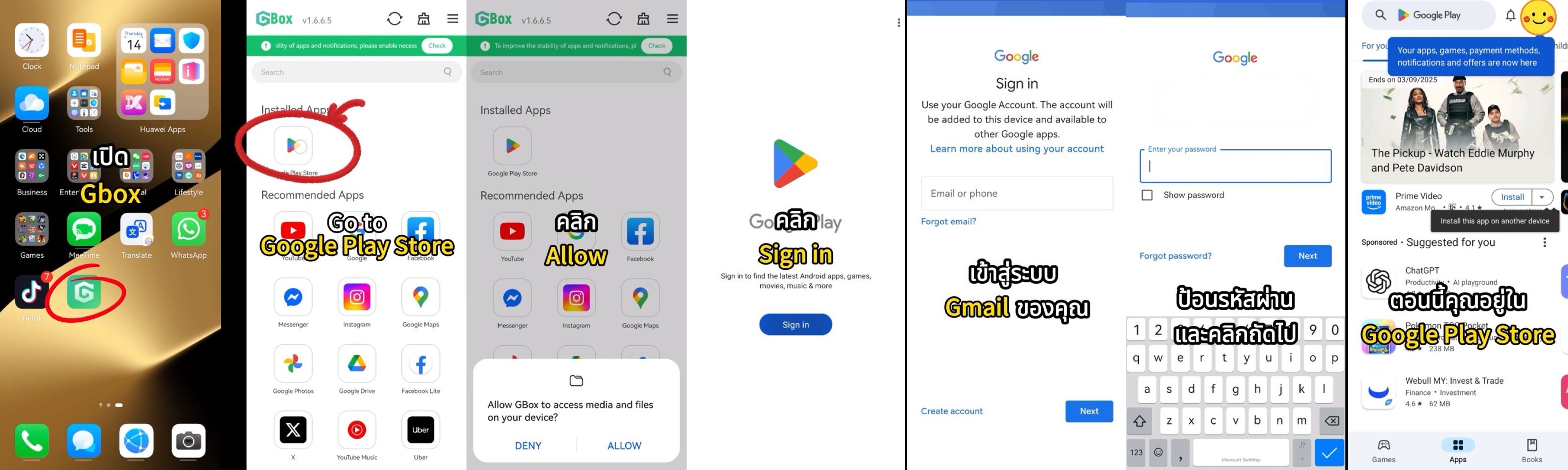 ขั้นตอนนี้จะปลดล็อกสมาร์ทโฟน HUAWEI ให้ซิงค์กับบริการ Google ได้ครบถ้วน เริ่มจากเปิดแอป GBox และเข้าไปที่ Google Play Store จากนั้นลงชื่อเข้าใช้ด้วยบัญชี Google ของคุณ เพียงแค่ลงชื่อเข้าใช้ตรงนี้ครั้งเดียว แอปพลิเคชันอย่าง Gmail, Google Maps, YouTube และแอป Google อื่นๆ ก็จะเริ่มซิงค์ข้อมูลทันที โดยไม่จำเป็นต้องลงชื่อเข้าใช้ซ้ำอีกในช่องทางอื่น