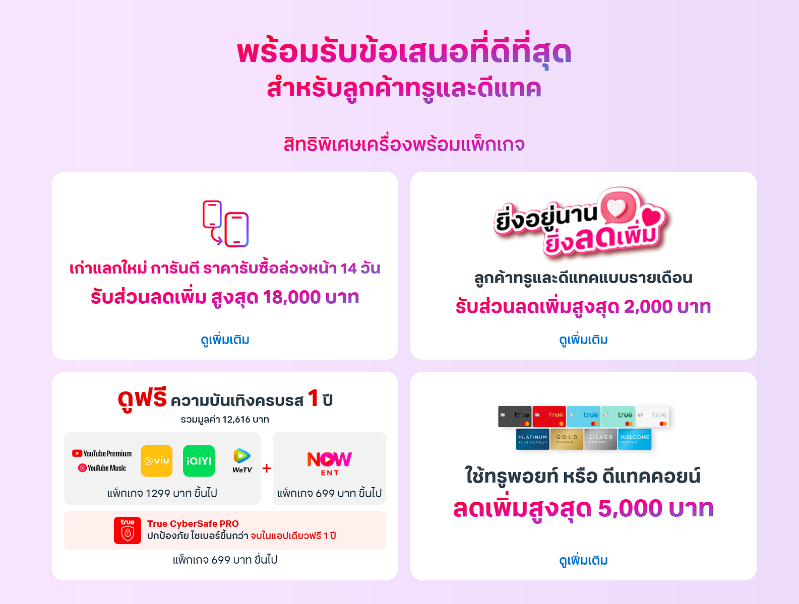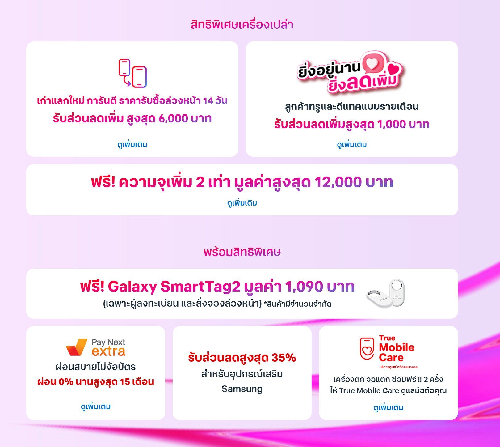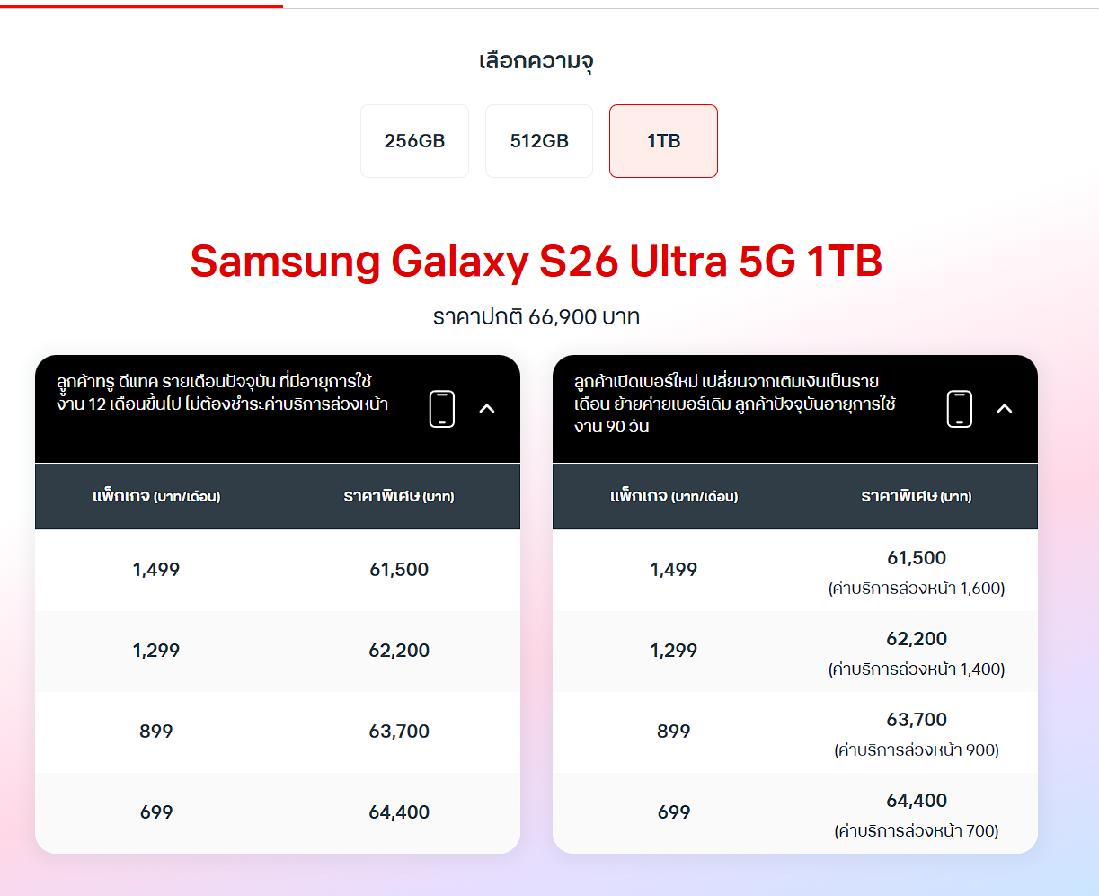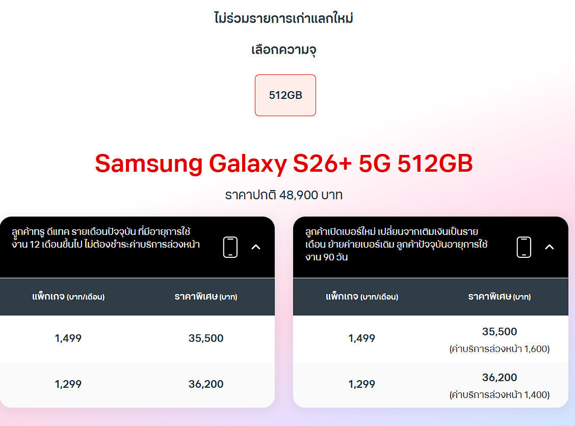โปรจอง Samsung S26 กับ True ลดโหด เทรดแรงสุดที่ 18,000 บาทโปรโมชันจอง Samsung Galaxy S26 Series กับ True ปี 2026! สรุปครบของแถมมีอะไรบ้าง สิทธิพิเศษสำหรับลูกค้าทรู-ดีแทค ทั้งส่วนลดค่าเครื่อง โปรเก่าแลกใหม่