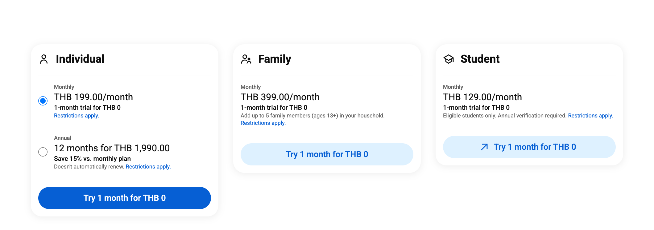- Premium (199 บาท): ดูวิดีโอไม่มีโฆษณา ใช้ YouTube Music ได้ เล่นเบื้องหลัง และดาวน์โหลดออฟไลน์ได้ครบ