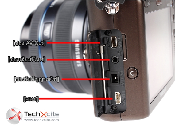 ด้านข้างซ้ายของตัวกล้องจะเป็นส่วนของ Port สำหรับเชื่อมต่อออกจอ LCD