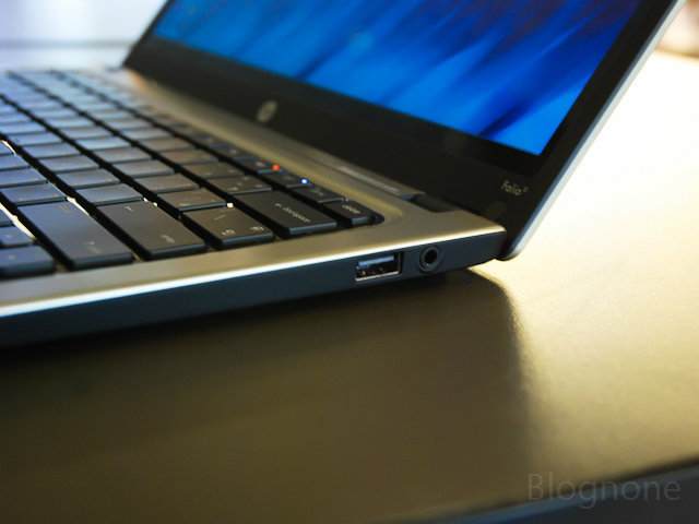 ด้านซ้ายของเครื่องไล่จากหลังมาหน้ามีรูสำหรับเสียบสายชาร์จ พอร์ตสำหรับต่อสาย LAN (ที่ ultrabook รุ่นอื่นๆ ไม่ค่อยมีกัน) พอร์ต HDMI, USB 3.0 หนึ่งพอร์ต และเมมโมรีการ์ดรีดเดอร์ครับ ส่วนไฟสองช่องนั้นเป็นไฟแสดงสถานะของ SSD และไฟแสดงสถานะว่าเปิดเครื่องอยู่