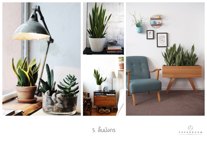 5. ลิ้นมังกร : พันธุ์ไม้ยอดฮิตสำหรับการปลูกในบ้าน เนื่องจากดูแลง่ายและทนทาน นอกจากคุณสมบัติในการคายออกซิเจนและดูดก๊าซคาร์บอนไดออกไซด์ในเวลากลางคืนแล้ว พันธุ์ไม้ชนิดนี้ยังช่วยลดปัญหาทางระบบหายใจและอาการปวดศีรษะได้อีกด้วย