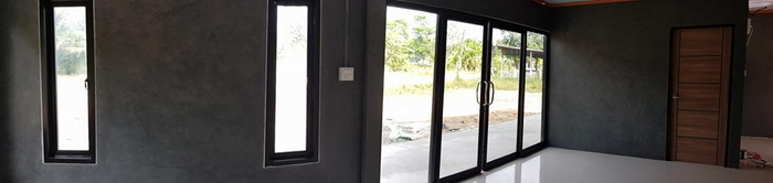 ผนังภายในตกแต่งสไตล์ปูนเปลือยสีทึบ แต่ก็ได้พื้นกระเบื้องแกรนิตโต้สีขาวมาช่วยเพิ่มความสว่างให้กับพื้นที่ใช้งานด้านใน