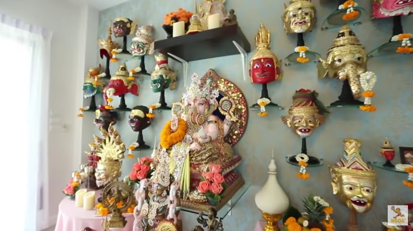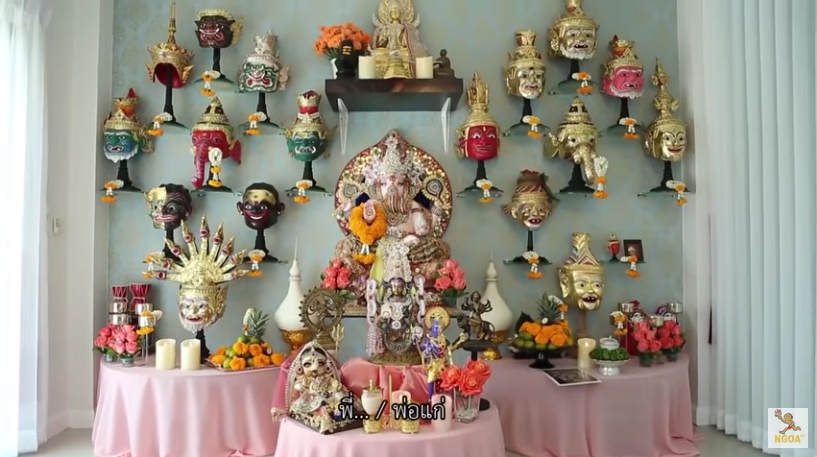 4.ท้าวเวสสุวรรณ ตั้งบูชาไว้บริเวณโต๊ะนั่งเล่นนอกตัวบ้าน ซึ่งเอ ไชยาเล่าถึงสาเหตุที่ต้องตั้งรูปบูชาท้าวเวสสุวรรณไว้นอกตัวบ้านเนื่องจาก ท้าวเวสสุวรรณนั้นมีลักษณะเป็นยักษ์ เจ้าของบ้านจึงเชื่อว่าจะช่วยป้องกันสิ่งชั่วร้ายต่างๆ ได้ เพราะปกติการออกไปแสดงลิเกตามต่างจังหวัด การตั้งโรงลิเกนั้นอาจไปตั้งในตำแหน่งที่ไม่สมควรอย่างป่าช้า เมรุ ฯลฯ เมื่อลิเกกลับมาที่บ้านอาจจะมีเศษดิน เศษทรายจากสถานที่เหล่านั้นติดมา จึงเชื่อว่าท้าวเวสสุวรรณจะสามารถป้องกันอันตรายต่างๆ ได้