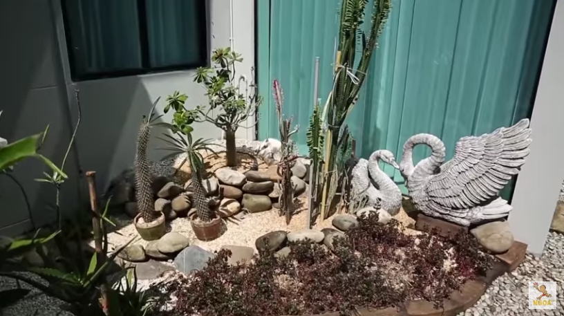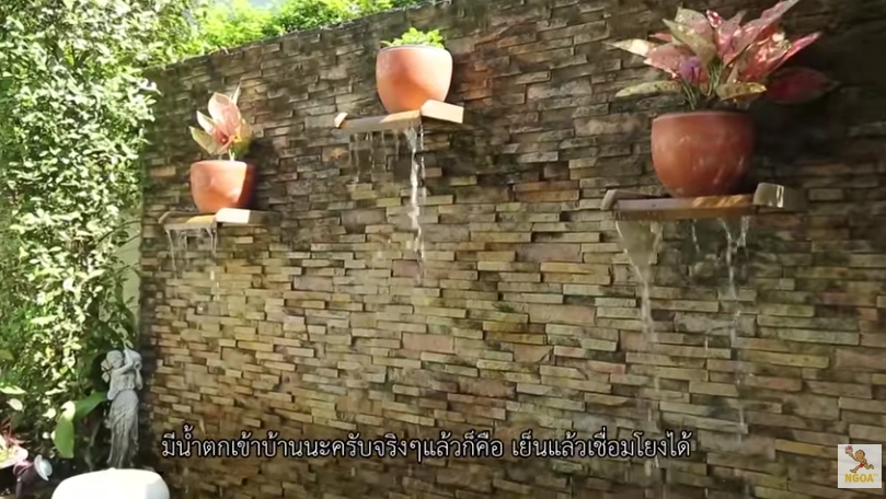 2.น้ำพุ และน้ำตก ถัดจากรั้วบ้านเป็นบริเวณสวนนอกบ้านที่ร่มรื่น ซึ่งก็มีน้ำพุ และน้ำตกประดับไว้ ซึ่งตามความเชื่อในด้านฮวงจุ้ยแล้วไม่ว่าจะเป็นน้ำพุ หรือน้ำตกก็ตาม ล้วนเป็นสิ่งที่สร้างพลังที่ดีให้กับบ้าน อย่างน้ำตกนั้นถ้าติดตั้งอย่างถูกต้องควรให้น้ำตกไหลเข้าสู่ตัวบ้าน ไม่ใช่ไหลออกนอกตัวบ้าน