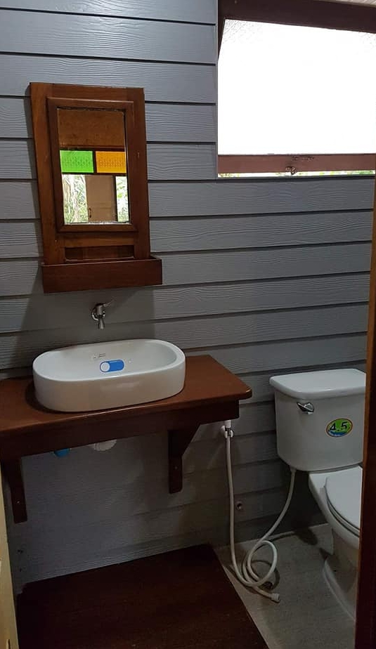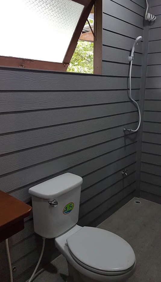 ห้องน้ำติดกับห้องนอน โดยวัสดุห้องน้ำเป็นผนังฝาไม้ทาสีเทาอ่อน ซึ่งให้ความรู้สึกอบอุ่นเป็นอย่างดี