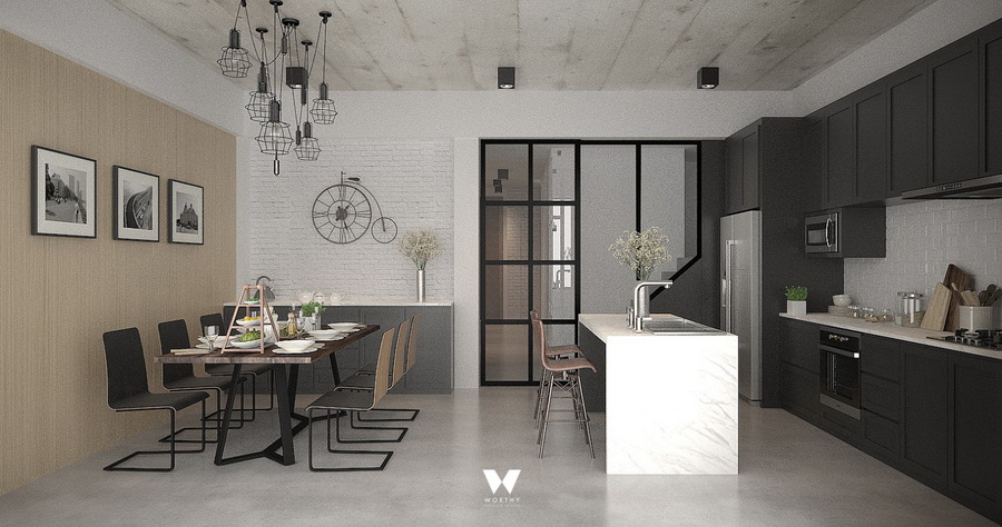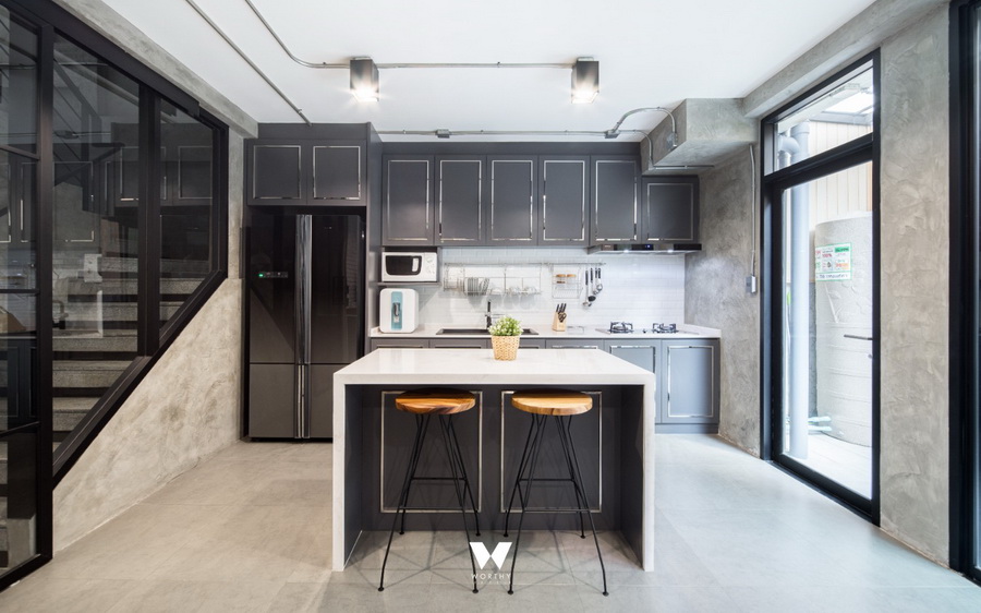 พื้นที่สุดท้ายของชั้น 1 คือ ห้องครัวและห้องทานข้าวครับ ส่วนด้านหลังผมดีไซน์ให้เป็นพื้นที่สีเขียวใช้ต้นไม้ปลอมติดผนังดูแลง่ายและสามารถนั่งเล่นหรือพักผ่อนได้ด้วยครับ