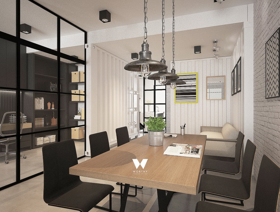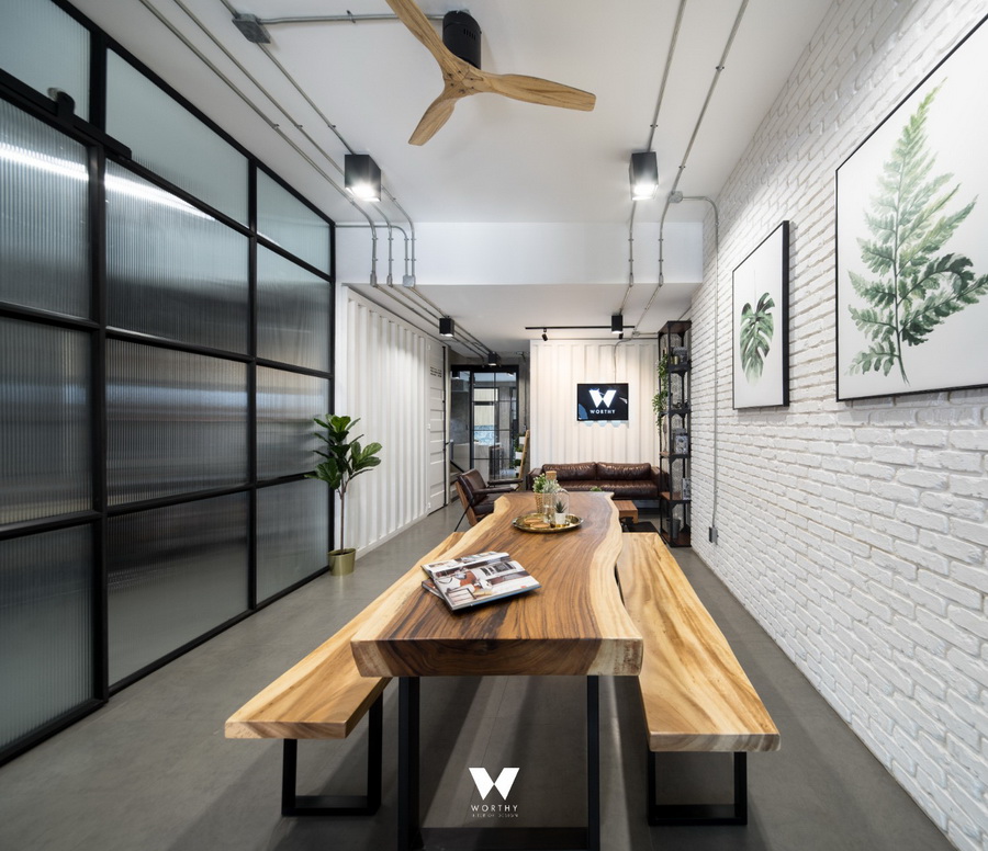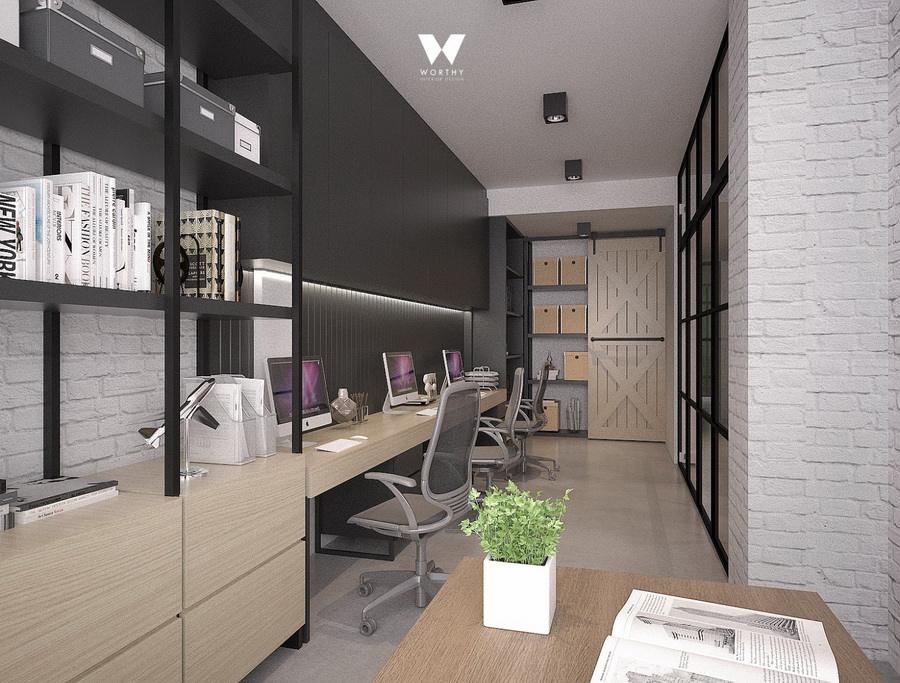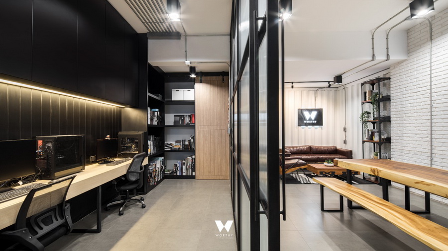 พื้นที่ออฟฟิศกั้นด้วยกระจกบานเลื่อนขนาดใหญ่ ทำให้ห้องดูไม่ทึบและอึดอัดเกินไปครับ