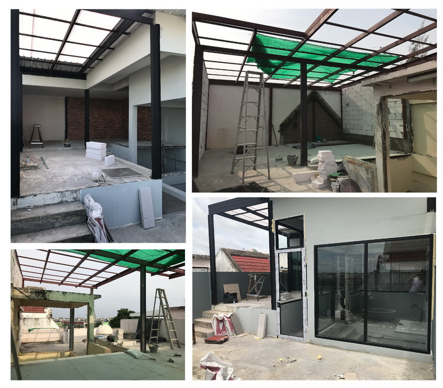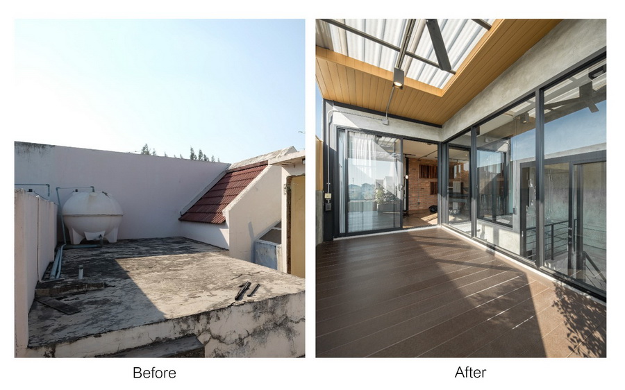 ในส่วนของชั้น 4 ชั้นดาดฟ้าผมเปลี่ยนแปลงโครงหลังคาเดิมที่เป็นกระเบื้องซึ่งมีน้ำหนักที่หนัก และใช้โครงสร้างหลังคาเหล็กมุงหลังคาใหม่ใช้วัสดุที่เบา ทำให้เราสามารถนำพื้นที่ด้านบนนี้มาใช้งานได้