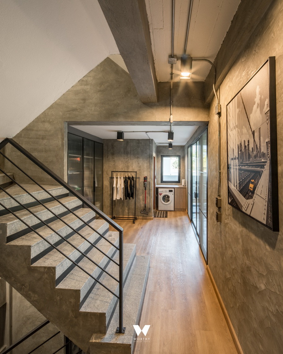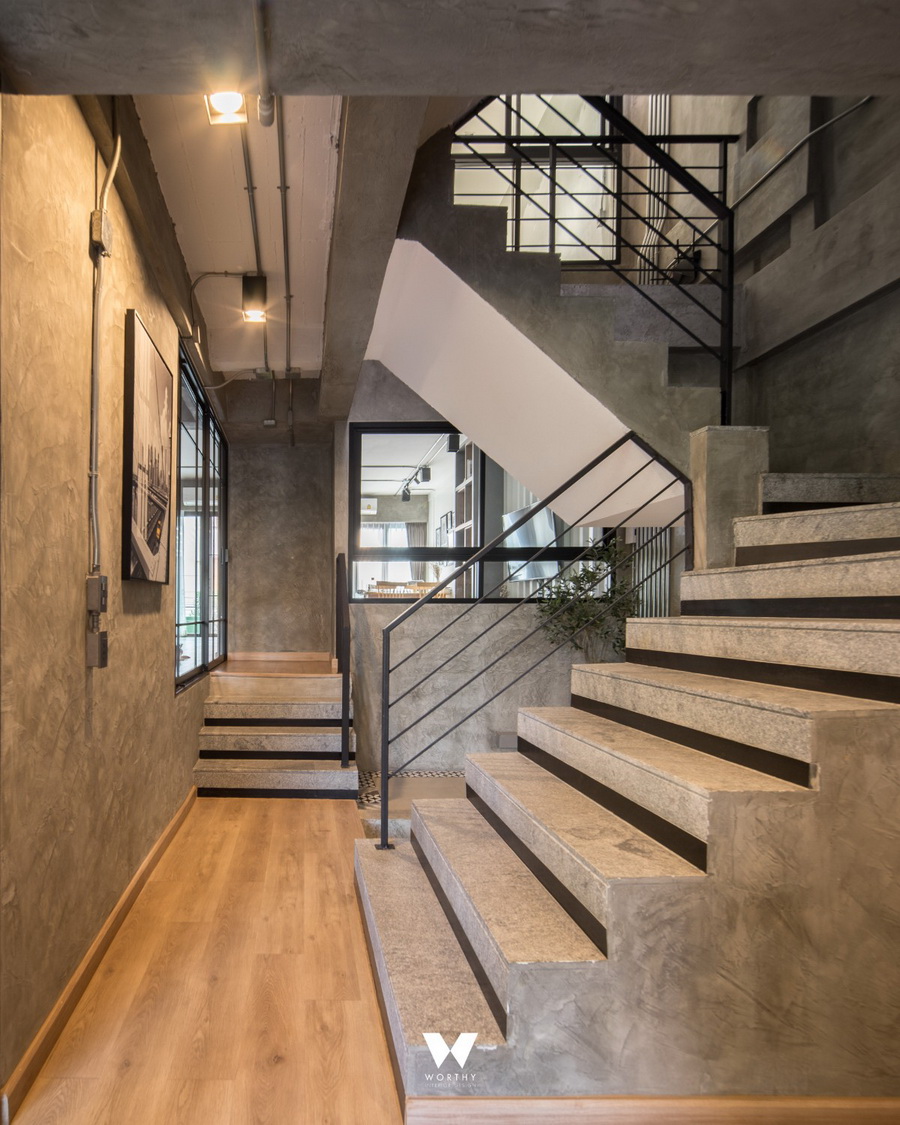 ชั้น 1 ผมเลือกใช้โทนสีเทา ขาว ดำ และใช้วัสดุเหล็ก ไม้ ปูนขัดมัน เน้นวัสดุที่สวยด้วยตัวเองไม่ต้องแต่งเติมอะไรมากครับ