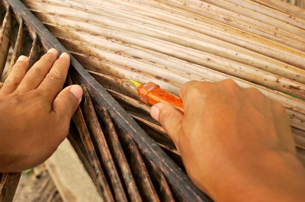 5. จากนั้นแบ่งก้านมะพร้าวแห้งออกเป็นมัดย่อยอีก แล้วนำเชือกไนล่อนมารัดแต่ละกำเล็ก ถักเชือกให้เรียงติดกันเป็นระเบียบ